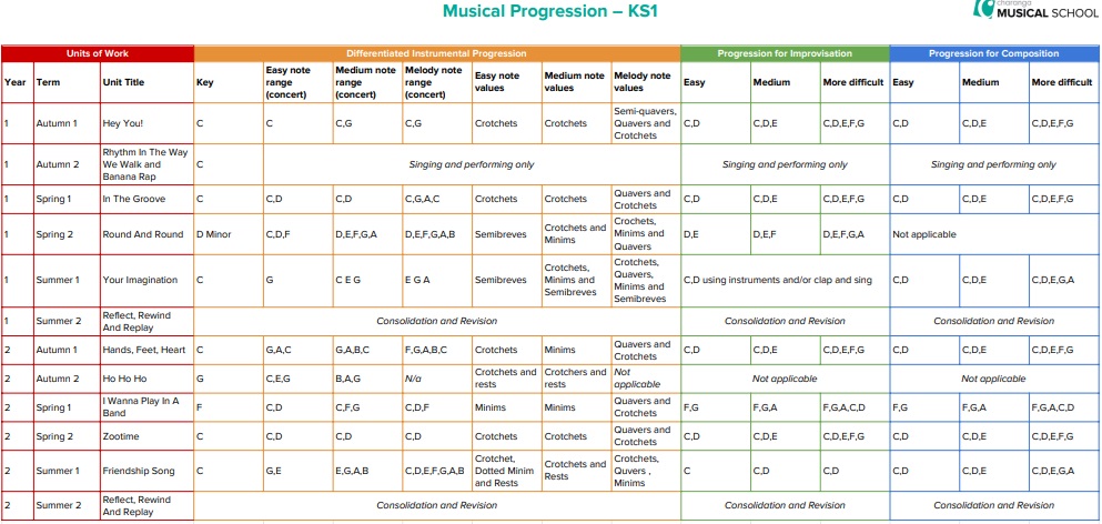 The musical progression through KS1 and KS2 is demonstrated in the diagrams below. The instrumental work is differentiated allowing children to move through the relevant parts as they need to.