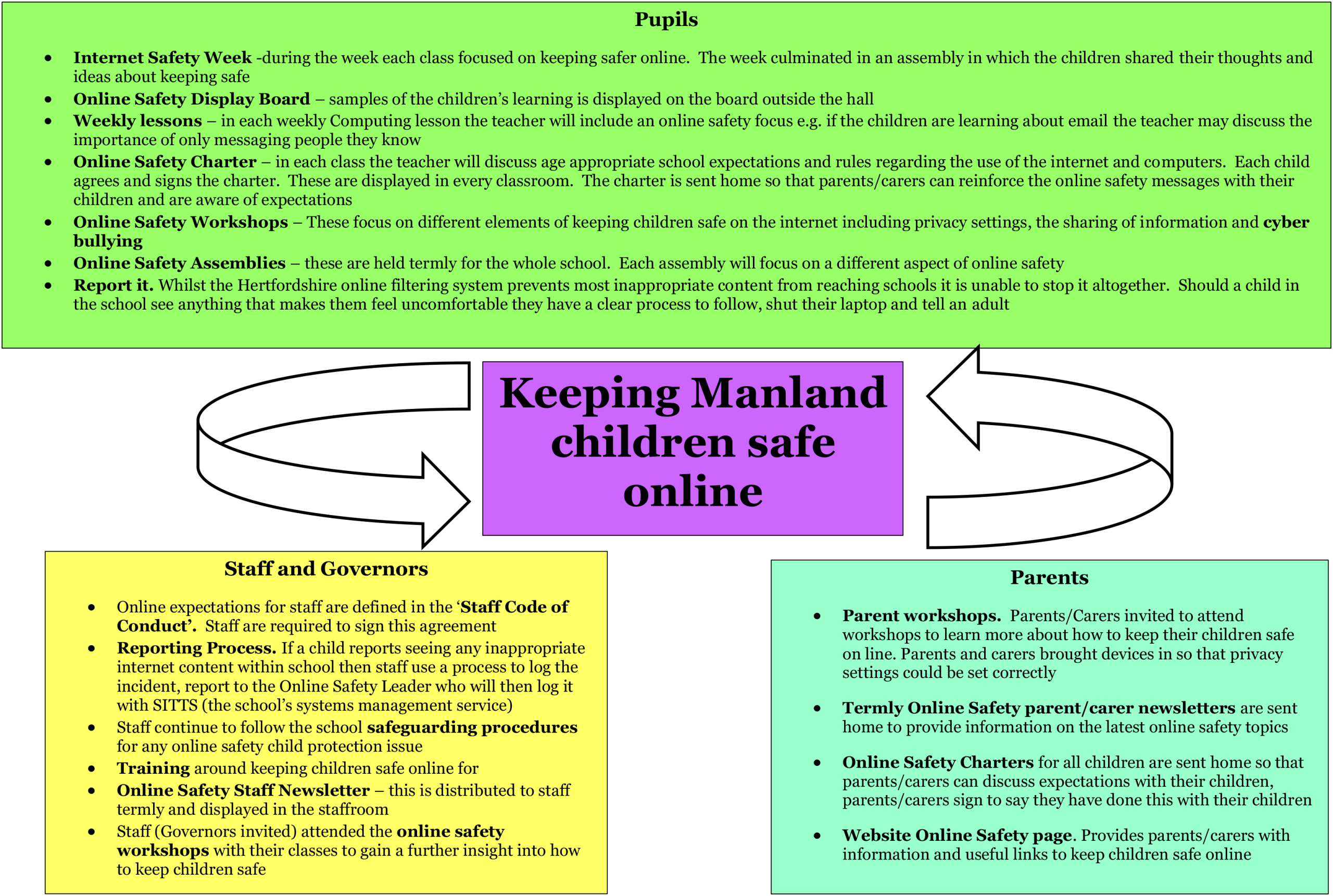 At Manland, we understand our responsibility to educate our pupils on internet safety issues; teaching them the appropriate behaviours and critical thinking skills to enable them to remain both safe and legal when using the internet and related technologies, in and beyond the context of the classroom.